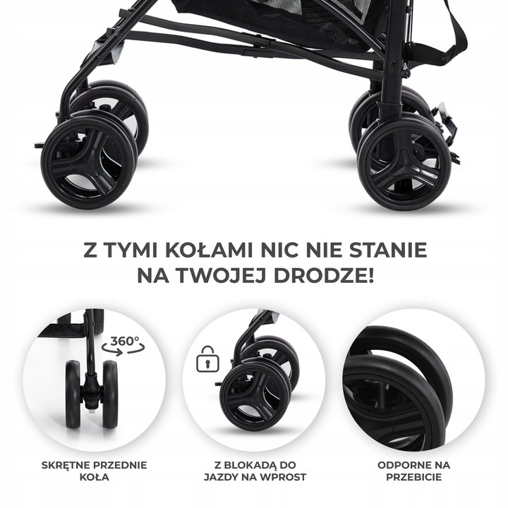 Koła spacerówki są lekkie i nieprzebijalne - nie musisz ich także pompować. Świetnie poradzą sobie z nierówną nawierzchnią. Przednie koła można zablokować do jazdy na wprost.