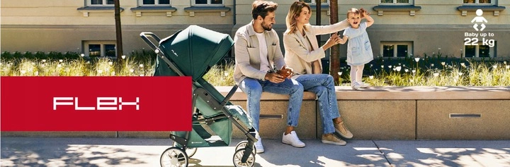 Specjalne 5-punktowe pasy bezpieczeństwa posiadają regulację wysokości, dzięki czemu siedzisko będzie wygodne zarówno dla maluszka jak i dla dużego dziecka o wadze do 22 kg. Budka przeciwsłoneczna zawieszona jest wysoko nas oparciem wózka, co sprawia, że FLEX bez problemu pomieści dziecko o wadze do 22 kg.