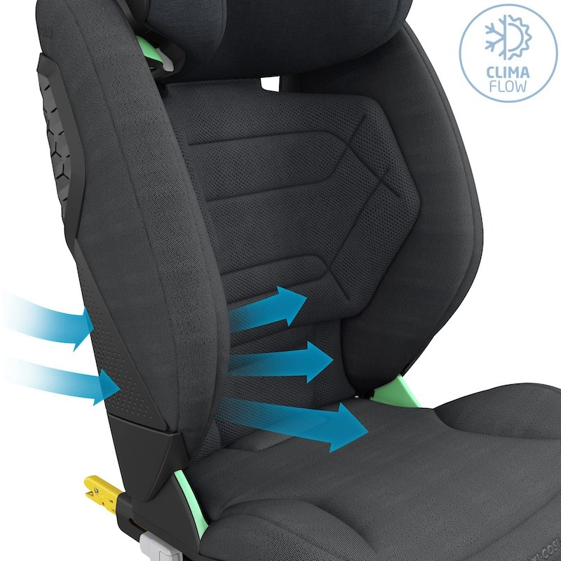 Fotelik samochodowy RodiFix Pro² i-Size oferuje trzy pozycje odchylenia, dzięki czemu Twoje dziecko może wygodnie obserwować świat przez okno, siedząc prosto, lub komfortowo zasnąć po odchyleniu oparcia. Poduszki AirProtect® nie tylko zapewniają ochronę, ale są także miękkie, utrzymując głowę dziecka w wygodnej pozycji podczas snu. Fotelik ma grubo wyściełane siedzisko i szerokie oparcie, co zwiększa komfort rosnącego dziecka. Model RodiFix Pro² i-Size wykonany jest z tkaniny Eco Care, w 100% pochodzącej z recyklingu, a jego elegancki wygląd podkreślają wysokiej jakości szwy i tłoczone emblematy marki. Dodatkowo fotelik wyposażony jest w ulepszone panele wentylacyjne ClimaFlow, oddychające tkaniny oraz piankę, które wspomagają cyrkulację powietrza, zapewniając dziecku optymalną temperaturę przez całą podróż.