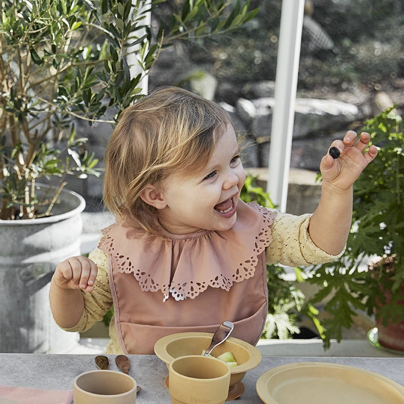 Stylowy śliniaczek szwedzkiej firmy Elodie Details, wyposażony w kieszonkę z przodu, zapewnia porządek i komfort w trakcie karmienia dziecka. Wykonane z szybkoschnącego materiału posiadającego certyfikat Oeko-Tex, całkowicie wolny od polichlorku winylu (PVC-free), idealne dopasowanie do potrzeb każdego dziecka. Śliniaczki wystarczy przetrzeć lub umyć po każdym użyciu i odczekać kilka minut aż wyschną. Śliniaczki są zapinane na duży miękki rzep. To produkt praktyczny i przyjazny dla środowiska.