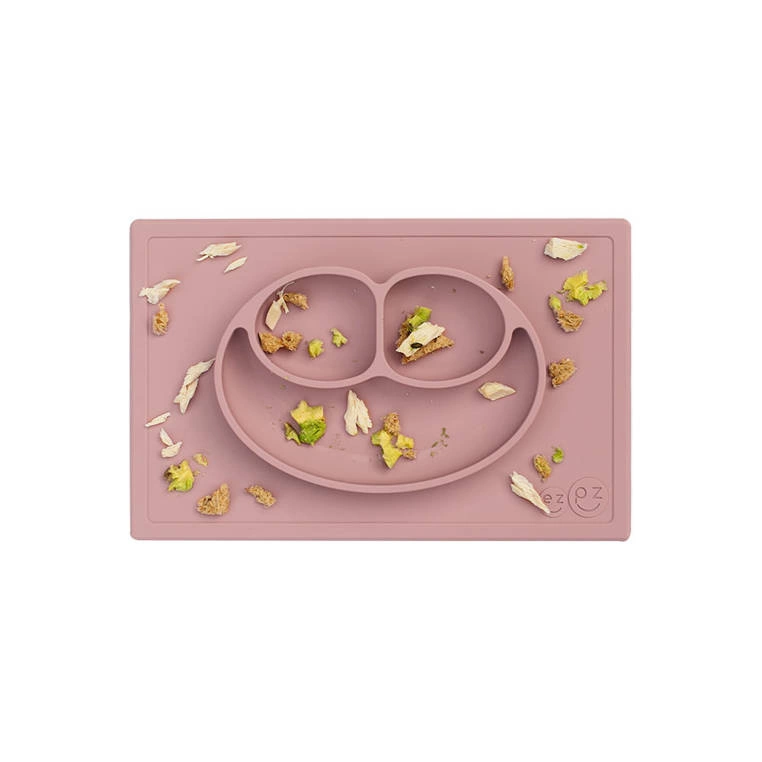 - EZPZ - Silikonowy talerzyk z podkładką 2w1 Happy Mat. Trójdzielny talerz EZPZ pozwala dzielić posiłki na porcje, co ułatwia malcowi naukę samodzielnego jedzenia. Nie zsuwa się ze stołu. Stabilny, łatwy do czyszczenia.