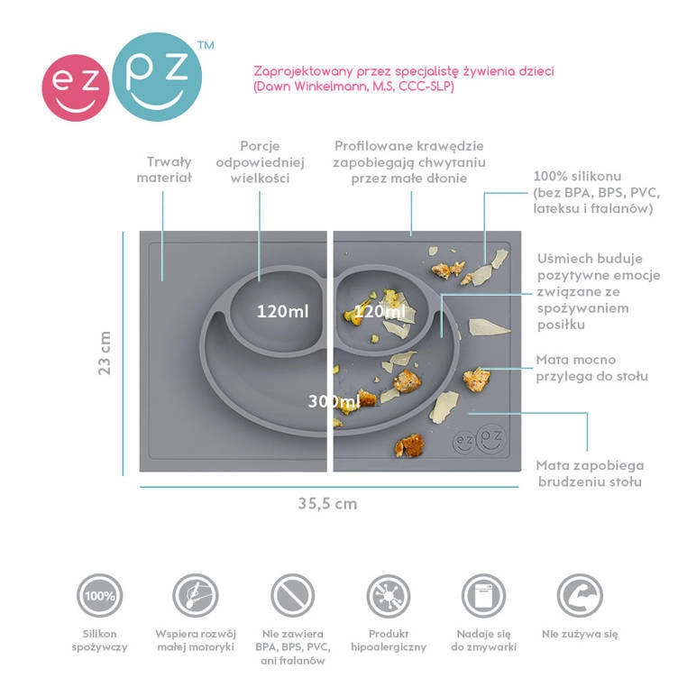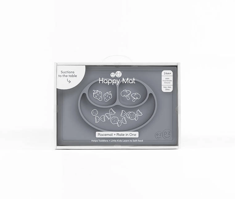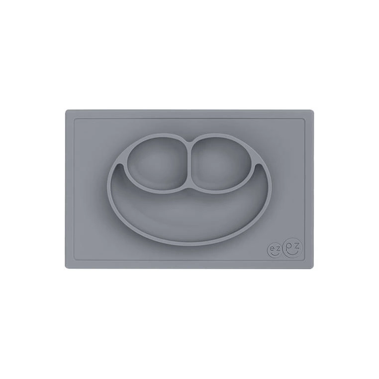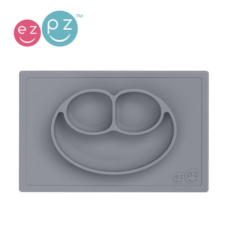 - EZPZ - Silikonowy talerzyk z podkładką 2w1 Happy Mat. Trójdzielny talerz EZPZ pozwala dzielić posiłki na porcje, co ułatwia malcowi naukę samodzielnego jedzenia. Nie zsuwa się ze stołu. Stabilny, łatwy do czyszczenia.