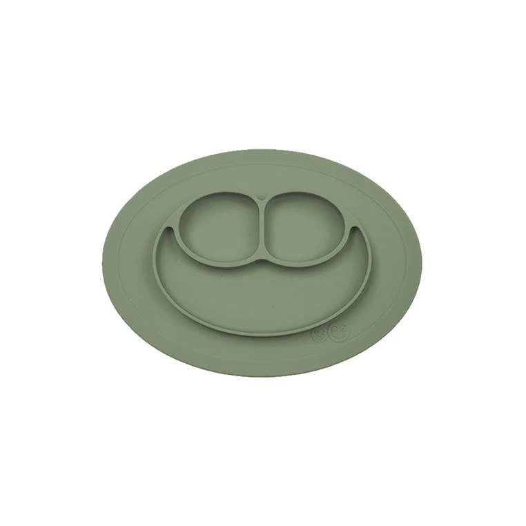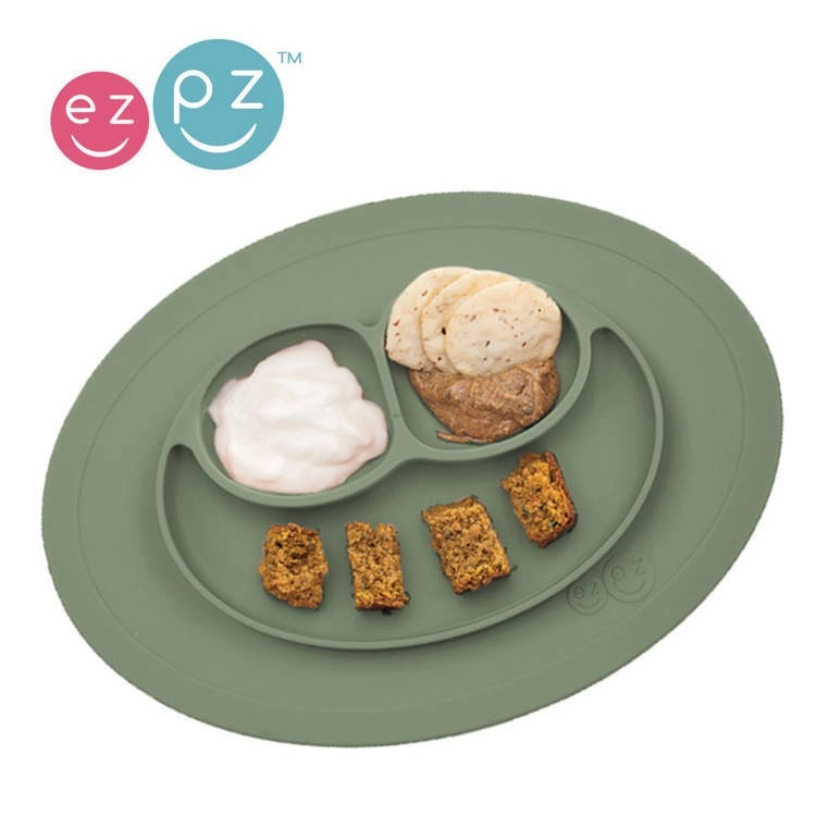 - EZPZ - Silikonowy talerzyk z podkładką mały 2w1 Mini Mat oliwkowy. Trójdzielny talerz EZPZ pozwala dzielić posiłki na porcje, co ułatwia malcowi naukę samodzielnego jedzenia. Nie zsuwa się ze stołu. Stabilny, łatwy do czyszczenia.