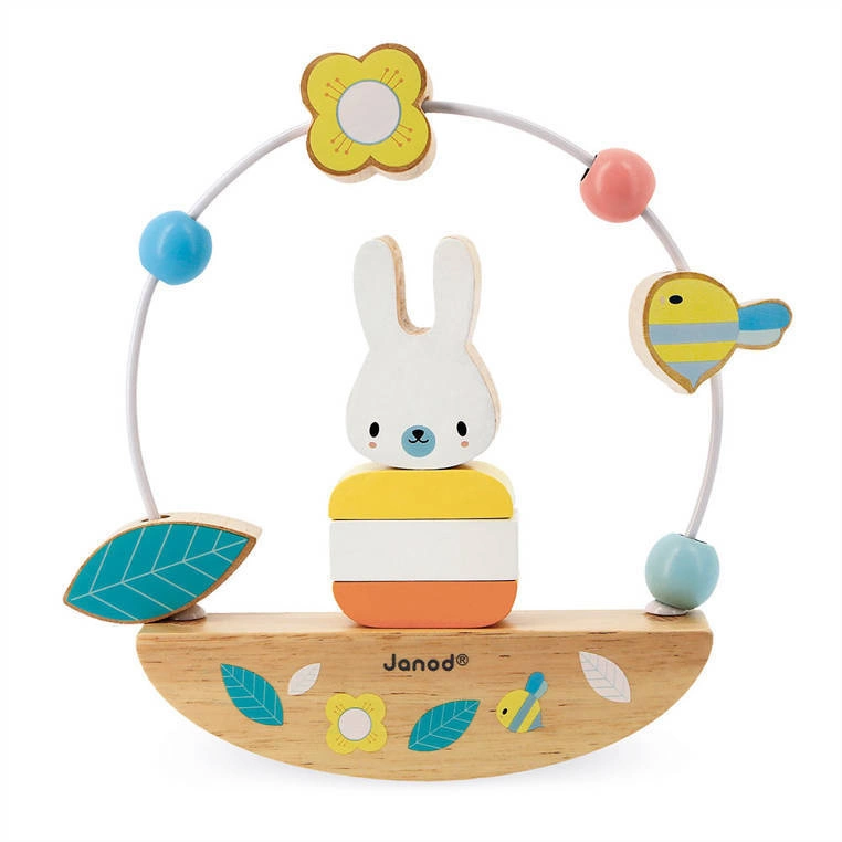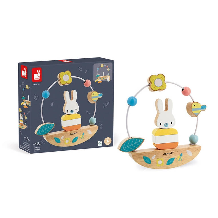 - Janod - Drewniana równoważnia z pętlą edukacyjną Zajączek Pure 12 m+. Przesuwanie klocków po pętli, układanie piramidki i utrzymywanie zabawki w równowadze rozwija koordynację ruchową i tzw. małą motorykę.