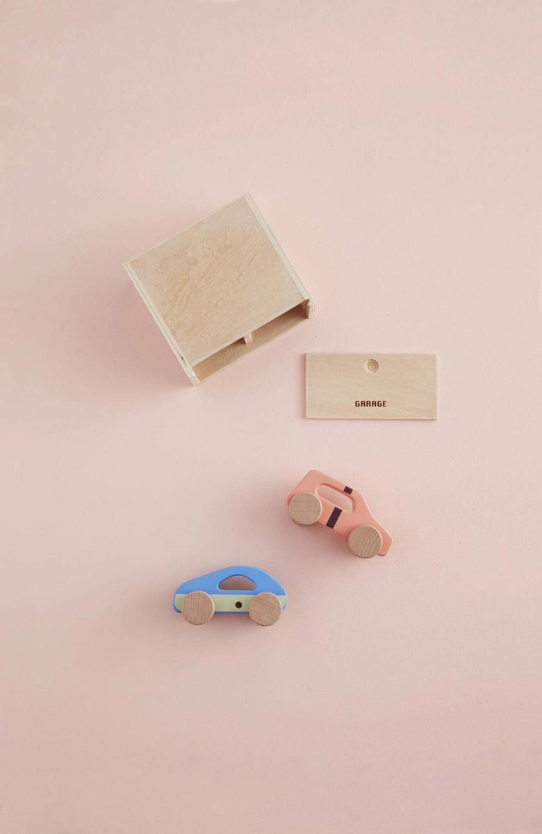 Zestaw zawiera drewniany garaż z miejscem na dwa pojazdy.