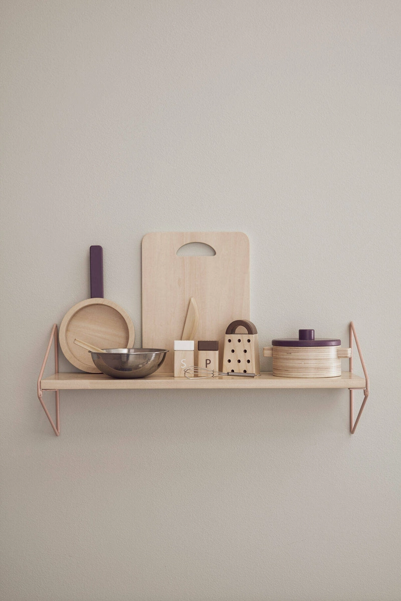 - Materiał: Garnek: sklejka, MDF. Patelnia: sklejka, buk. Miska, trzepaczka: stal nierdzewna. Deska do krojenia, tarka, sztućce, sól i pieprz: buk.