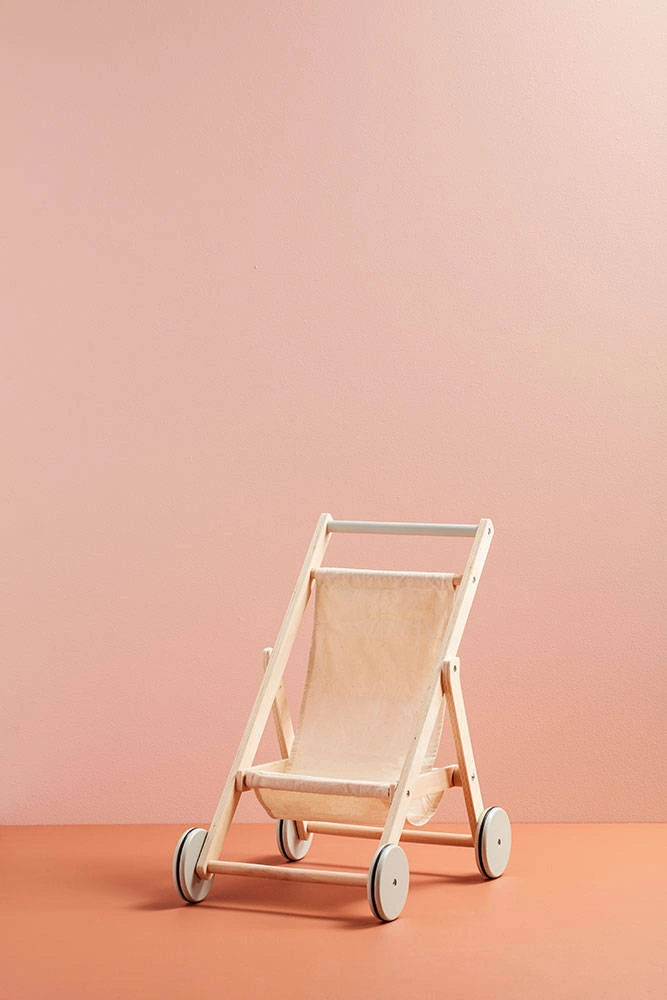 Wózek ma urocze szare koła i małą kieszeń z tyłu, na drobiazgi. Do jego wykonania użyto przede wszystkim niebielonej bawełny i sklejki lipowej. Zarówno Teddy, jak i Dolly będą wygodnie siedzieć podczas wszystkich Twoich podróży w wózku dla lalek.