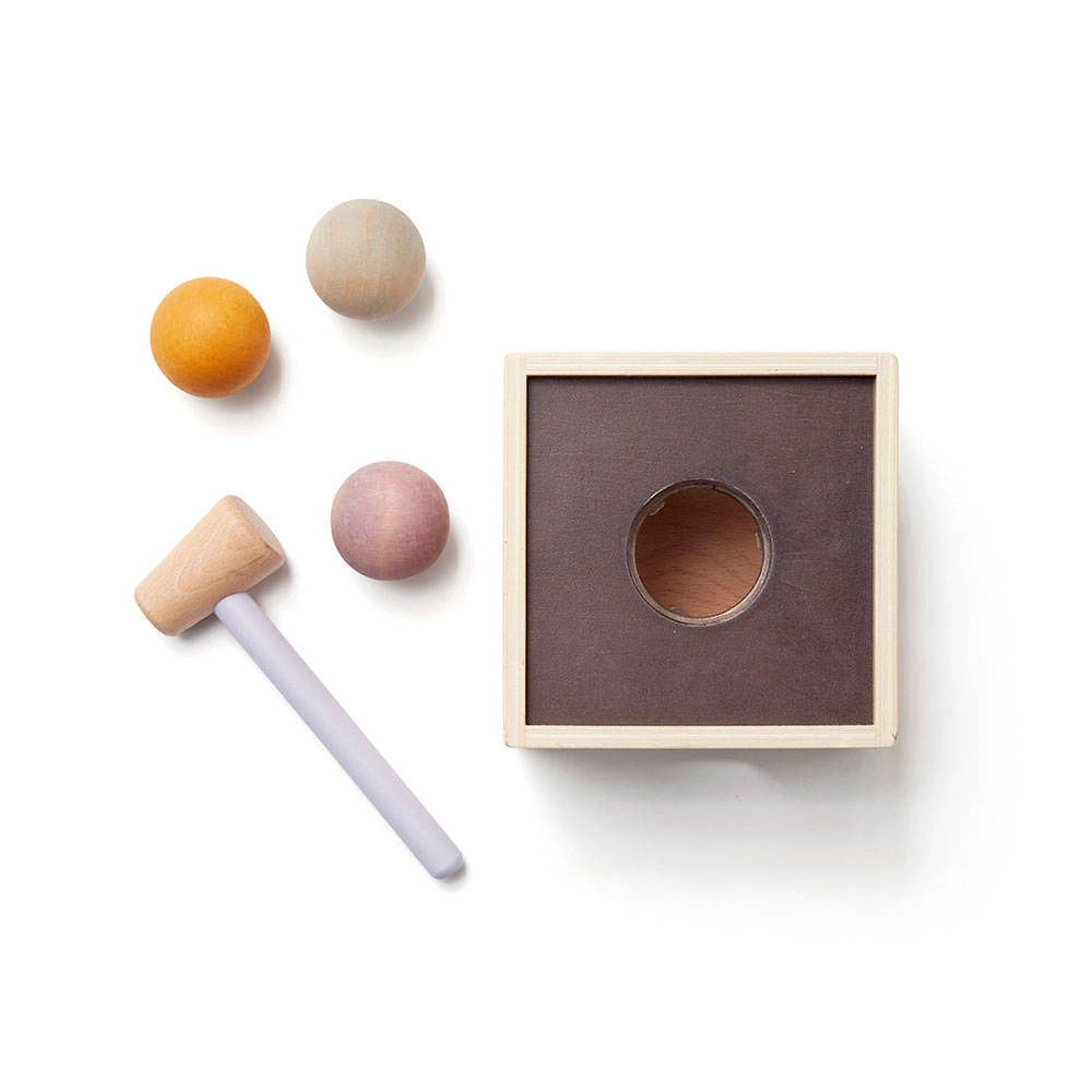 Umieść drewnianą kulkę w otworze w pudełku i uderz młotkiem, aby wpadła do środka. Bam, bam, bam, uważaj! Nigdy nie wiadomo, z której strony wypadnie kulka. Zestaw zawiera trzy bejcowane drewniane kulki w różnych kolorach i młotek.