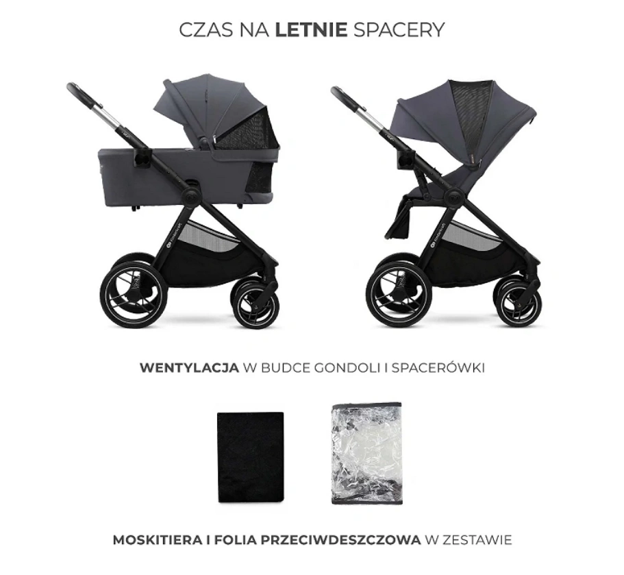 materac do gondoli, uchwyt na kubek, folia przeciwdeszczowa, moskitiera, adaptery do fotelika samochodowego, osobne osłony do gondoli oraz spacerówki, torba