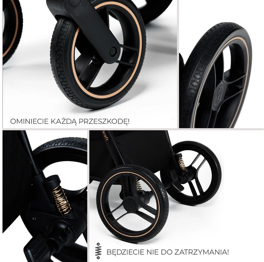 Duże, bezobsługowe koła wykonane z trwałej gumy oraz system amortyzacji na 4 koła zapewniają płynność jazdy nawet po nierównym terenie. Dzięki temu bez trudu podbijesz wózek nawet na wysokim krawężniku.