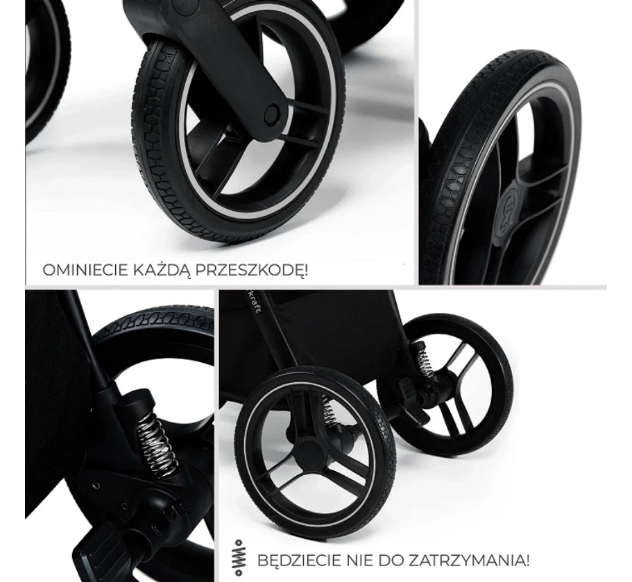Duże, bezobsługowe koła wykonane z trwałej gumy oraz system amortyzacji na 4 koła zapewniają płynność jazdy nawet po nierównym terenie. Dzięki temu bez trudu podbijesz wózek nawet na wysokim krawężniku.