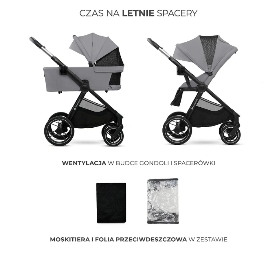 materac do gondoli, uchwyt na kubek, folia przeciwdeszczowa, moskitiera, adaptery do fotelika samochodowego, osobne osłony do gondoli oraz spacerówki, torba