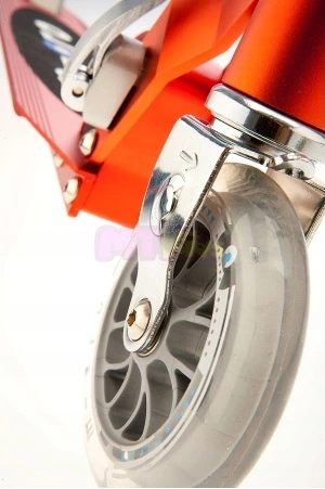 • Hamulec został pomysłowo zaprojektowane tak, żeby nawet najmniejszy nacisk stopy na niego powodował łagodne zatrzymanie hulajnogi