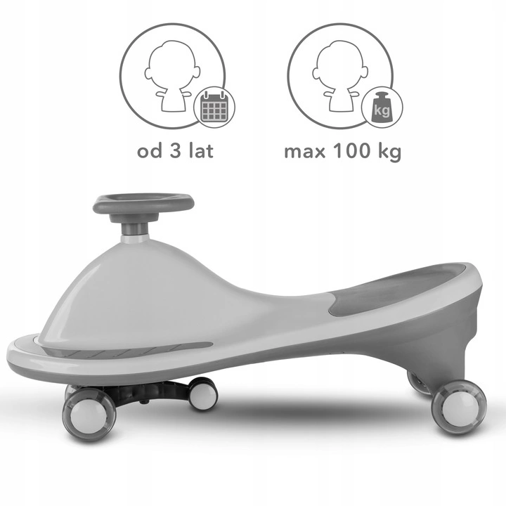 Grawitacyjny jeździk został przystosowany do jazdy dla dzieci od 3. roku życia, ale szaleć do woli mogą na nim nawet dorośli! Lekka, ale stabilna konstrukcja bez problemu utrzyma osoby do 100 kg.