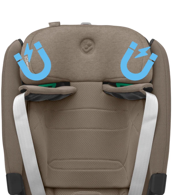 W ochraniaczach pasów 5-punktowej uprzęży fotelika zostały zamontowane magnesy, które sprawiają, że szelki nie przeszkadzają, ułatwiając wygodne umieszczanie dziecka w samochodzie.