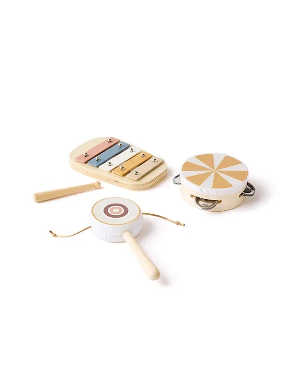 Zróbmy hałas! Kid's Concept - Zestaw muzyczny składa się z mini bębenka, tamburyna, cymbałek z pałeczką w rozmiarze odpowiednim dla małych rączek dziecka.