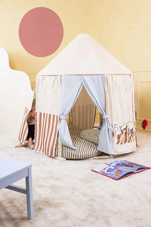 Namiot z praktycznymi kieszeniami (oczywiście inspirowanymi fartuchem Mamy Muminków) zarówno na zewnątrz, jak i wewnątrz, pomieści małe książeczki lub zabawki, dzięki czemu zawsze możesz mieć to, czego potrzebujesz, w swoim przytulnym miejscu.