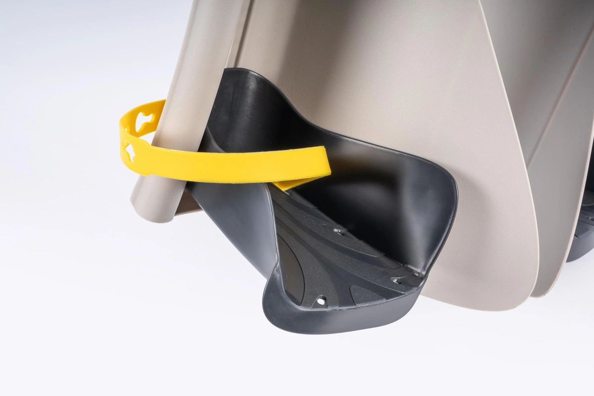 Fotelik rowerowy Bellelli PEPE STANDARD wyposażony jest w szerokie burty oraz podnóżki z paskami zabezpieczającymi, które skutecznie chronią nóżki dziecka przed wkręceniem się w szprychy koła, zapewniając dodatkową ochronę.