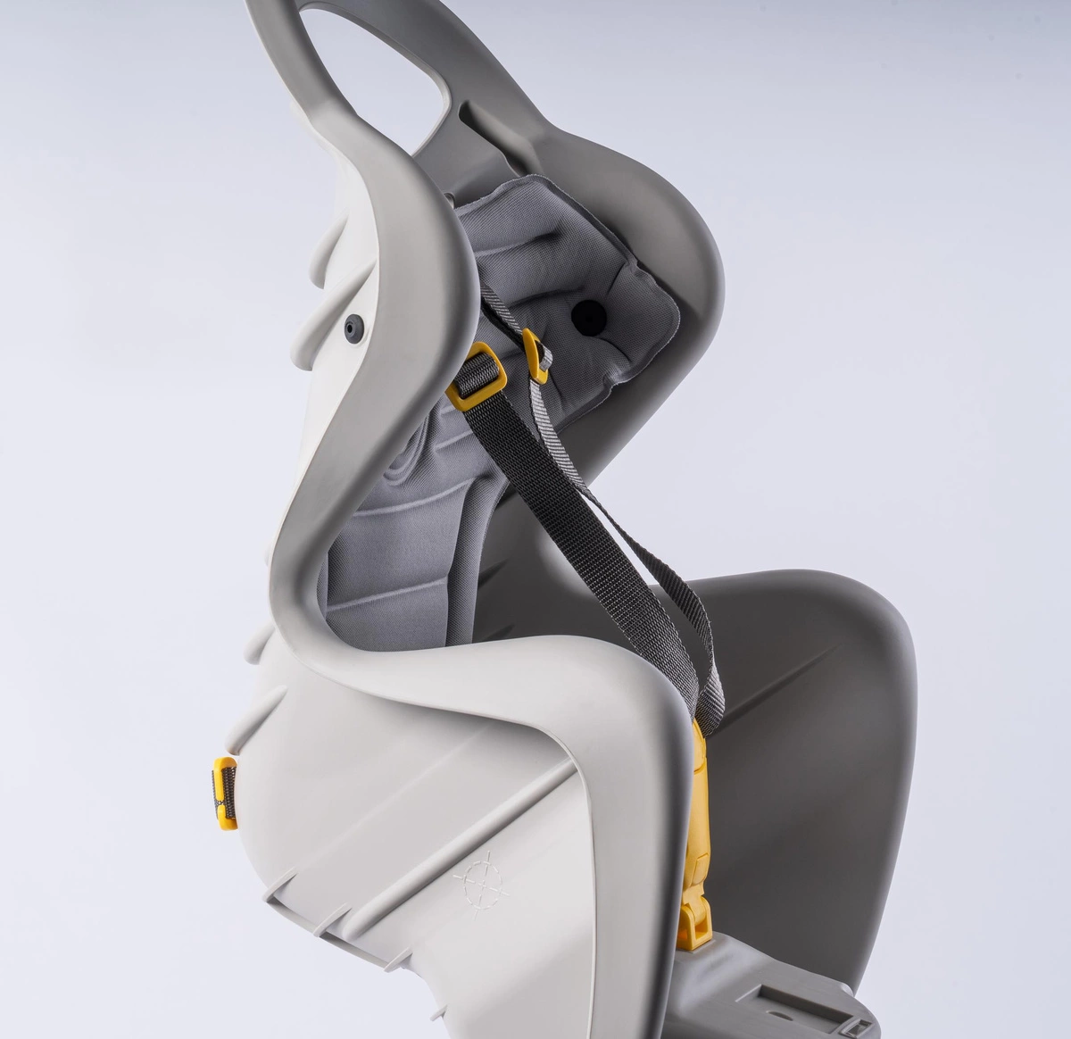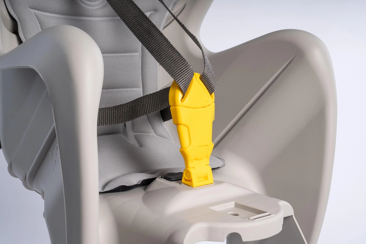 - Dodatkowy pas zabezpieczający – chroni przed zsunięciem fotelika z bagażnika, zaczepiany o sztycę siodła lub rurę podsiodłową (nie o bagażnik)