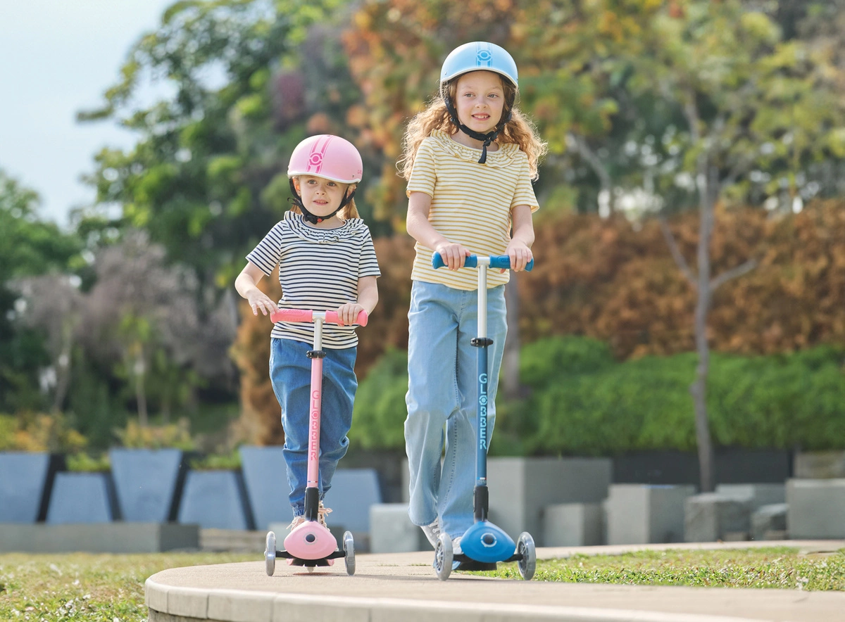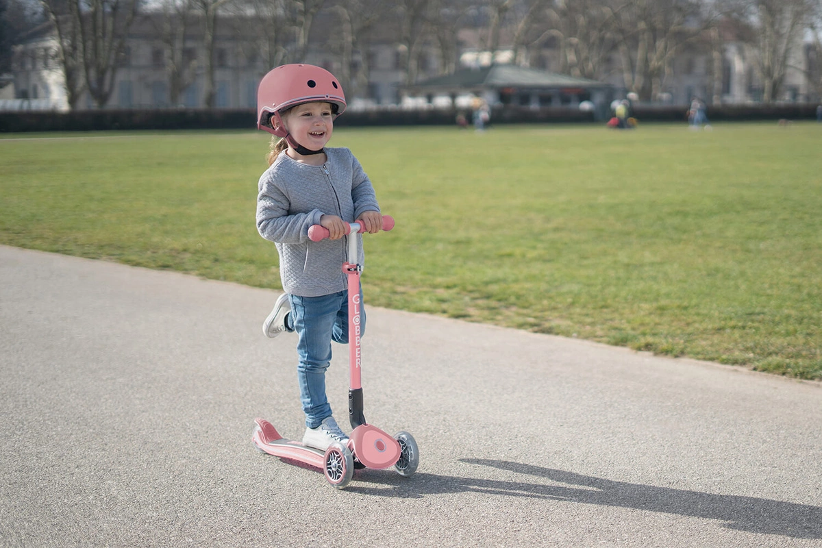 - 3-kołowa hulajnoga z opatentowanym przez Globber systemem składania z bezpiecznym przyciskiem, który składa hulajnogę w tryb wózka. Wygodnie przenoś, tocz lub przechowuj po zabawie!