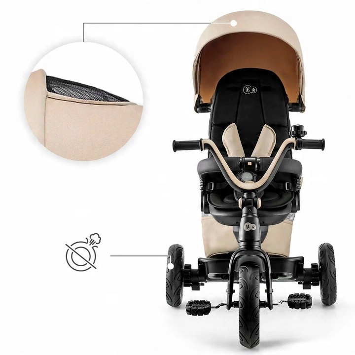 Siedzisko rowerka jest nie tylko obrotowe, ale posiada również wysokie oparcie z możliwością odchylenia do pozycji półleżącej, która doskonale sprawdza się w trakcie drzemki. Barierka pokryta pokrowcem z ekoskóry jest przyjemna w dotyku, a podnóżek świetnie sprawdza się, gdy dziecko chce odpocząć od prób pedałowania.