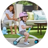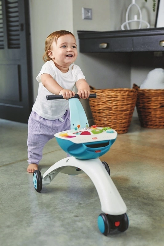 Eksploruj otoczenie wewnątrz i na zewnątrz - na początku z przednim kołem zablokowanym dla zdobywania równowagi na jeździku i umiejętności jeżdżenia a następnie z przednim kołem odblokowanym, obracającym się o 360°, zapewniającym pełne możliwości z jeżdżenia.