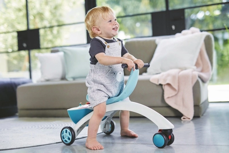 Wspieranie pierwszych kroków dziecka przy użyciu mechanizmu kontroli prędkości - przednie koło jeździka jest zablokowane i jedzie wyłącznie na wprost