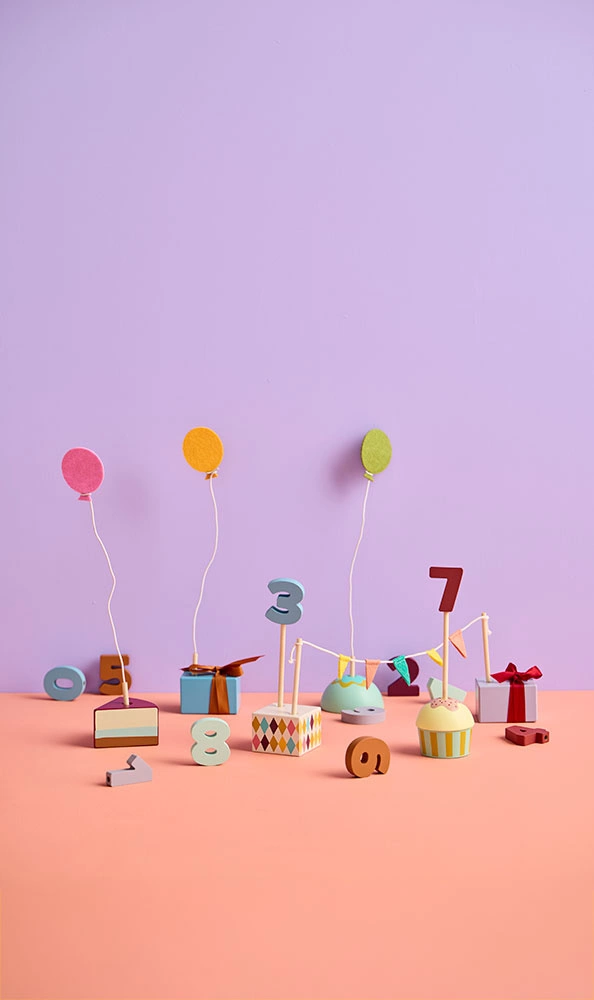 - Drewniany zestaw dekoracyjny na urodziny z cyframi 0–9 i kolorowymi elementami. Wielorazowy, na każde urodziny.