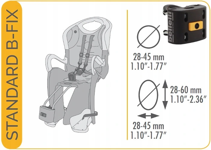 • Bellelli Tiger Standard B-FIX to fotelik rowerowy z mocowaniem do rury podsiodłowej (ramy). Posiada regulowaną wysokość oparcia w zakresie 47-54cm. Dysponuje 5-punktowymi pasami bezpieczeństwa. Fotelik przeznaczony jest dla dzieci o wadze do 22kg.