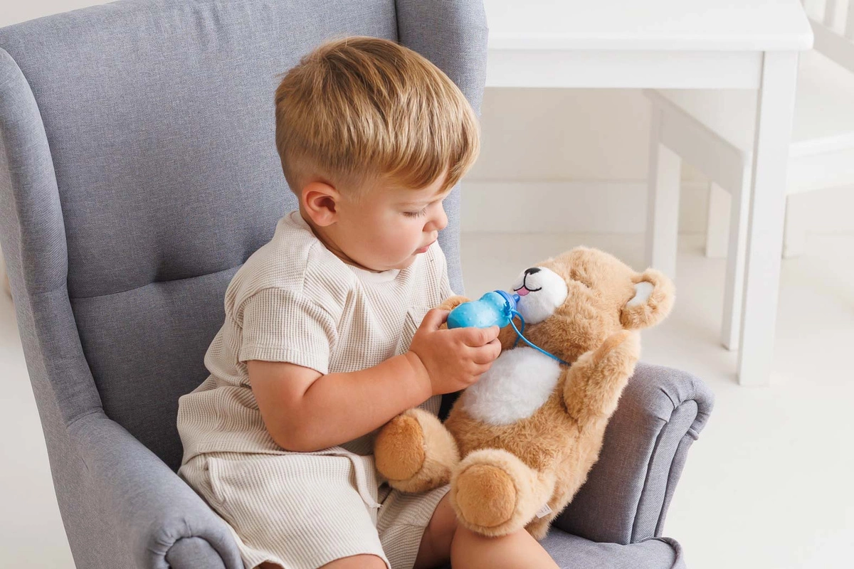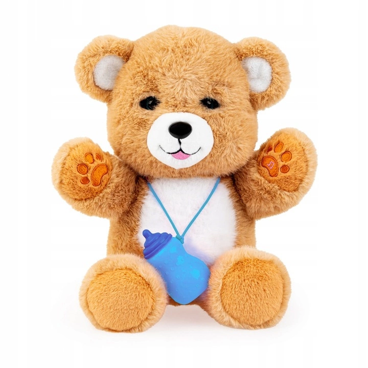 Pogłaszcz go po główce lub brzuszku i nakarm dołączoną do zestawu buteleczką, a z radością odwdzięczy się „misiowymi” odgłosami, zamykając przy tym i otwierając oczka.
