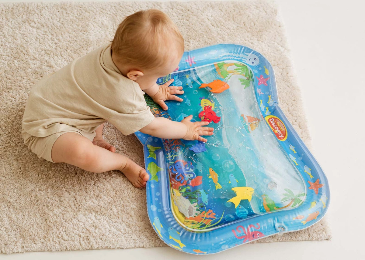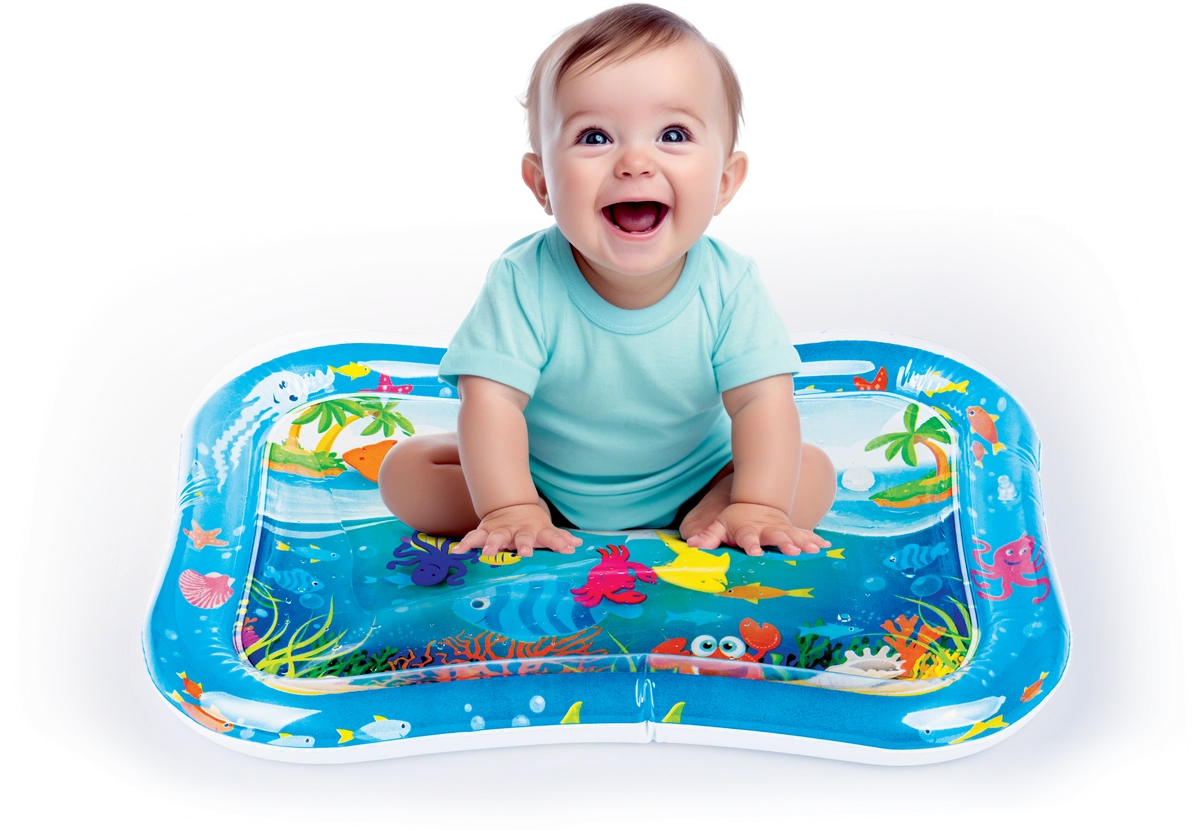 Matę zdobią przyjazne obrazki, które umilą najmłodszym zabawę. Krawędź wyposażona jest w ukryty zawór, służący do nadmuchania brzegu maty, natomiast na spodzie znajduje się zawór do napełnienia środkowej części maty wodą. Gdy maluch położy się na środku maty lub przyciśnie go rączką, woda zafaluje, wprawiając w ruch kolorowe rybki.