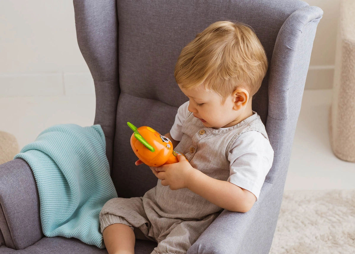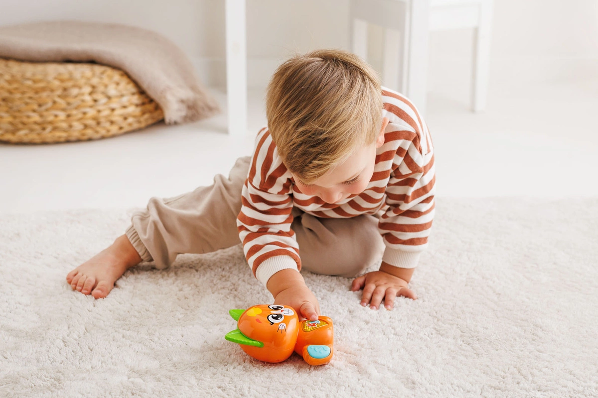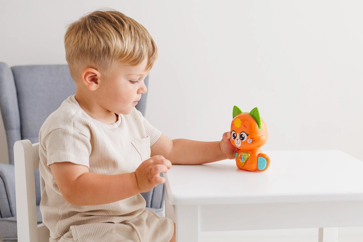Przycisk na pierwszej z nich uruchamia tryb wyzwań, w którym kotek aktywizuje najmłodszych trzema propozycjami zabaw. Druga łapka uruchamia melodie. Kociak wyposażony został w praktyczny przełącznik ON/OFF, umożliwiający wyłączenie zwierzaka po zakończonej zabawie.