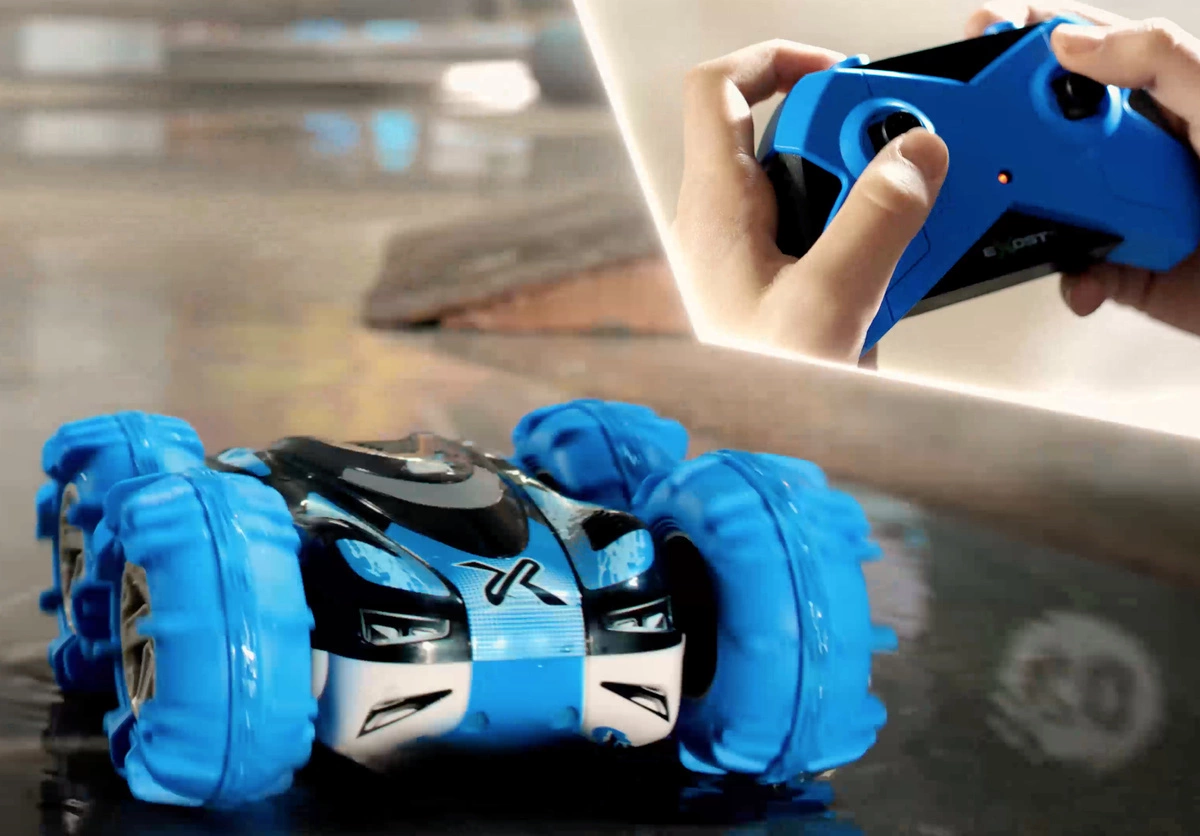 2,4 GHz, a steruje się nim za pomocą dołączonego do zestawu pilota. Samochód potrafi jeździć po wodzie oraz po lądzie, poruszając się przy tym we wszystkich kierunkach. Potężne opony ułatwiają mu pokonywanie niewielkich przeszkód, a przejeżdżając przez nie AquaCross obraca się o 360 stopni zmieniając swój wygląd! Wszystko za sprawą dwustronnego korpusu, którego górna i dolna część różnią się kolorem. Dzięki temu w jednej chwili możesz przekształcić auto w zupełnie nowy pojazd!