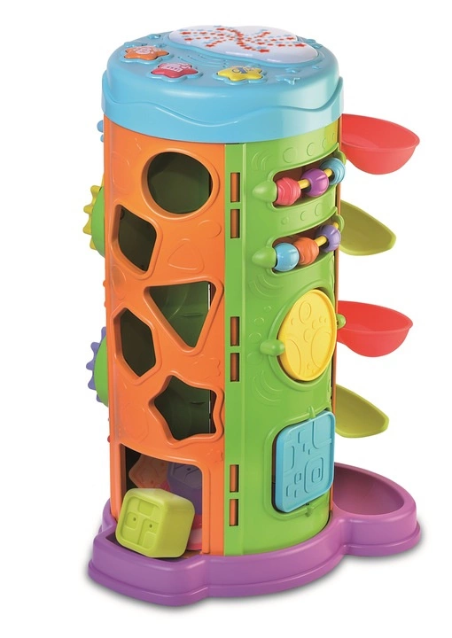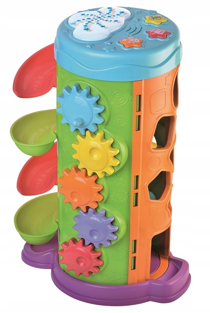 Na każdej ze stron znajduje się tu inna zabawa, która pozwoli dziecku ćwiczyć motorykę małą, poznawać zależności przyczynowo – skutkowe i rozwijać zdolności poznawcze. Wśród kolorowych ścianek zabawki pochowało się 5 różnych zabaw: zjeżdżalnia z piłeczkami, trybiki do kręcenia, sorter kształtów z klockami do dopasowania, ruchome elementy do przesuwania i obracania, a także, na samej górze, urocza chmurka z przyciskami aktywującymi melodie i kolorowe, świetlne wzorki.