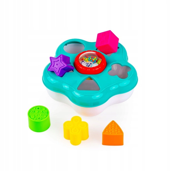 Uroczy sorter – kwiatek posiada pięć ramion, a na każdym z nim znajduje się otwór w innym kształcie. Zadanie malucha polega na dopasowaniu klocków z zestawu do odpowiednich otworów.
