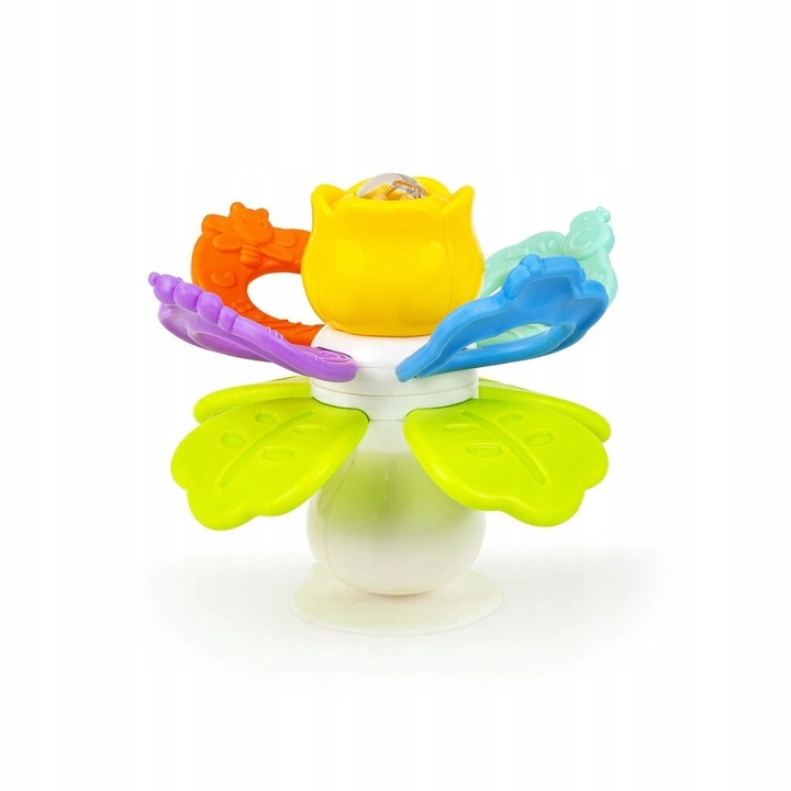 Zabawka składa się z miękkich oraz twardych gryzaków, kwiatka z ukrytą w jego wnętrzu grzechotką, z wesołego terkotka, którego aktywuje przekręcanie względem siebie górnych i dolnych gryzaków, oraz z praktycznej przyssawki. Dzięki niej przymocujesz zabaweczkę do dowolnej, czystej, płaskiej i gładkiej powierzchni, aby zajęła maluszka wesołym przekręcaniem i grzechotaniem w konkretnym miejscu.