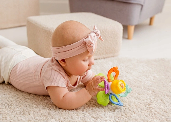 - Elementy zabawki: Miękkie gryzaki, twarde gryzaki, kwiatek z grzechotką