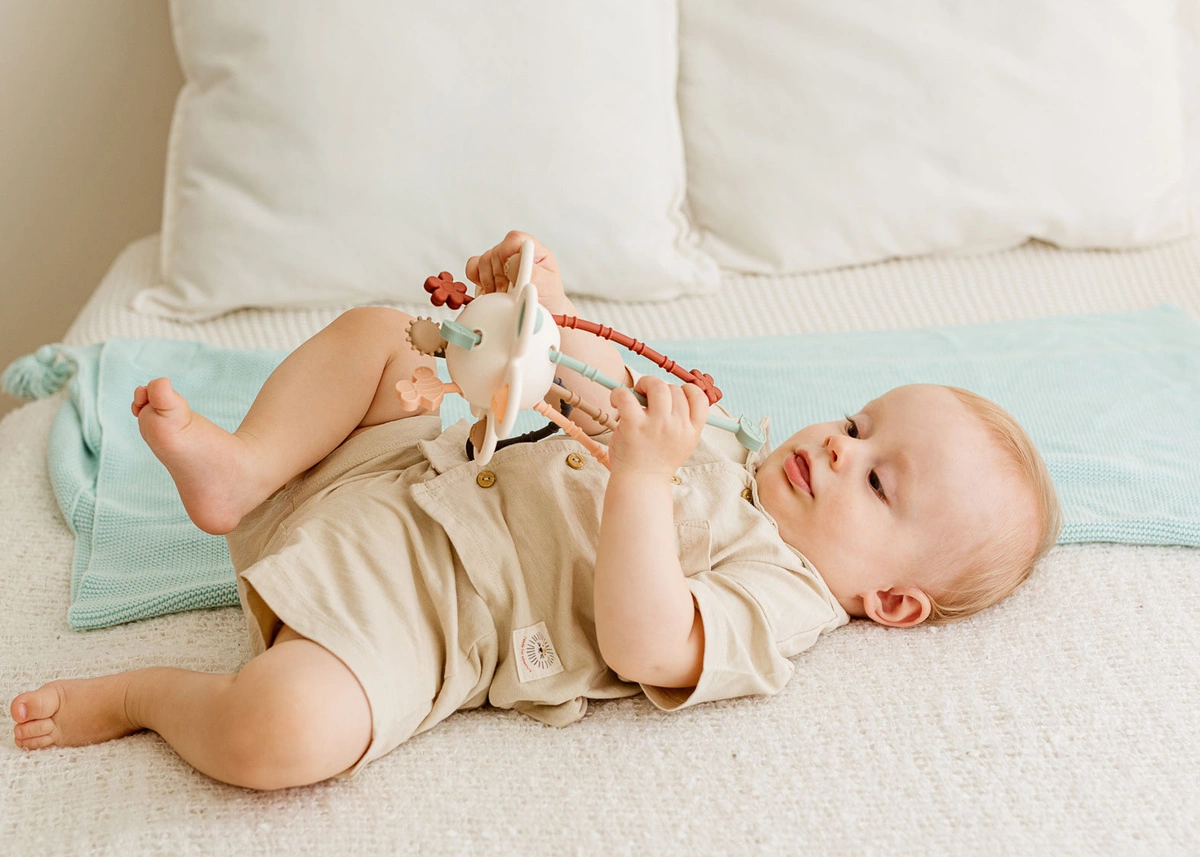 Ta stylowa zabawka w pięknych kolorach ziemi zapewni moc sensorycznej zabawy. Znajdziemy tu kilka kuleczek do wciskania i wyciskania z powrotem na górę oraz pięć kolorowych linek do przeciągania. Każdą z nich zdobią wypustki i urocze kształty.
