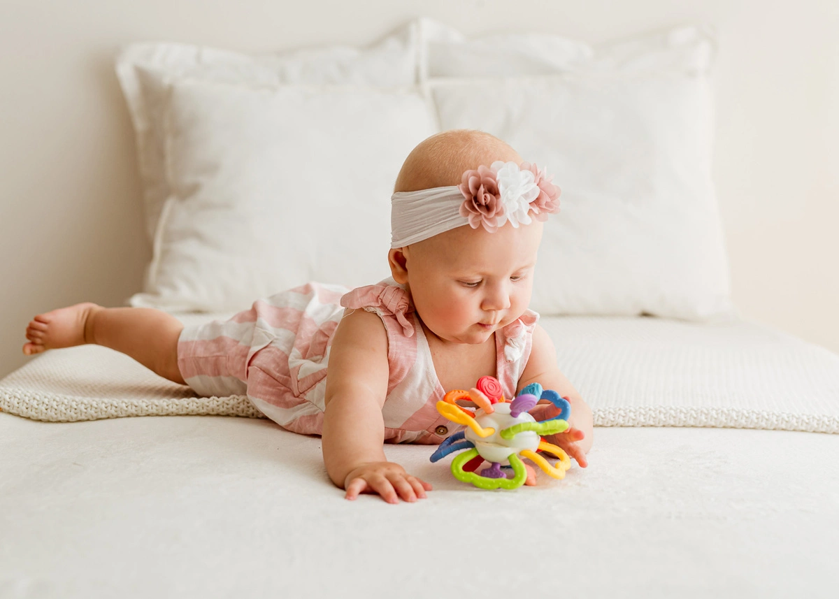 Poza miękkimi, nafaszerowanymi wypustkami, uchwytami, pełniącymi zarazem funkcję gryzaków, znajdują się tu miękkie kształty, także z wypustkami, które podczas gryzienia, przyniosą ulgę obolałym dziąsłom ząbkującego maluszka. Przy przekręcaniu połówek zabawki w odwrotnych kierunkach względem siebie, wydaje ona zabawny, miły dla ucha odgłos.