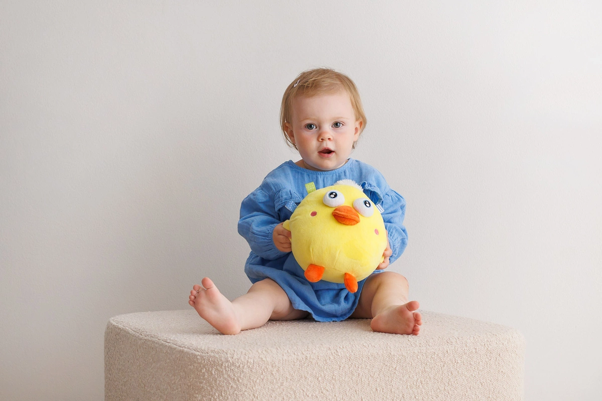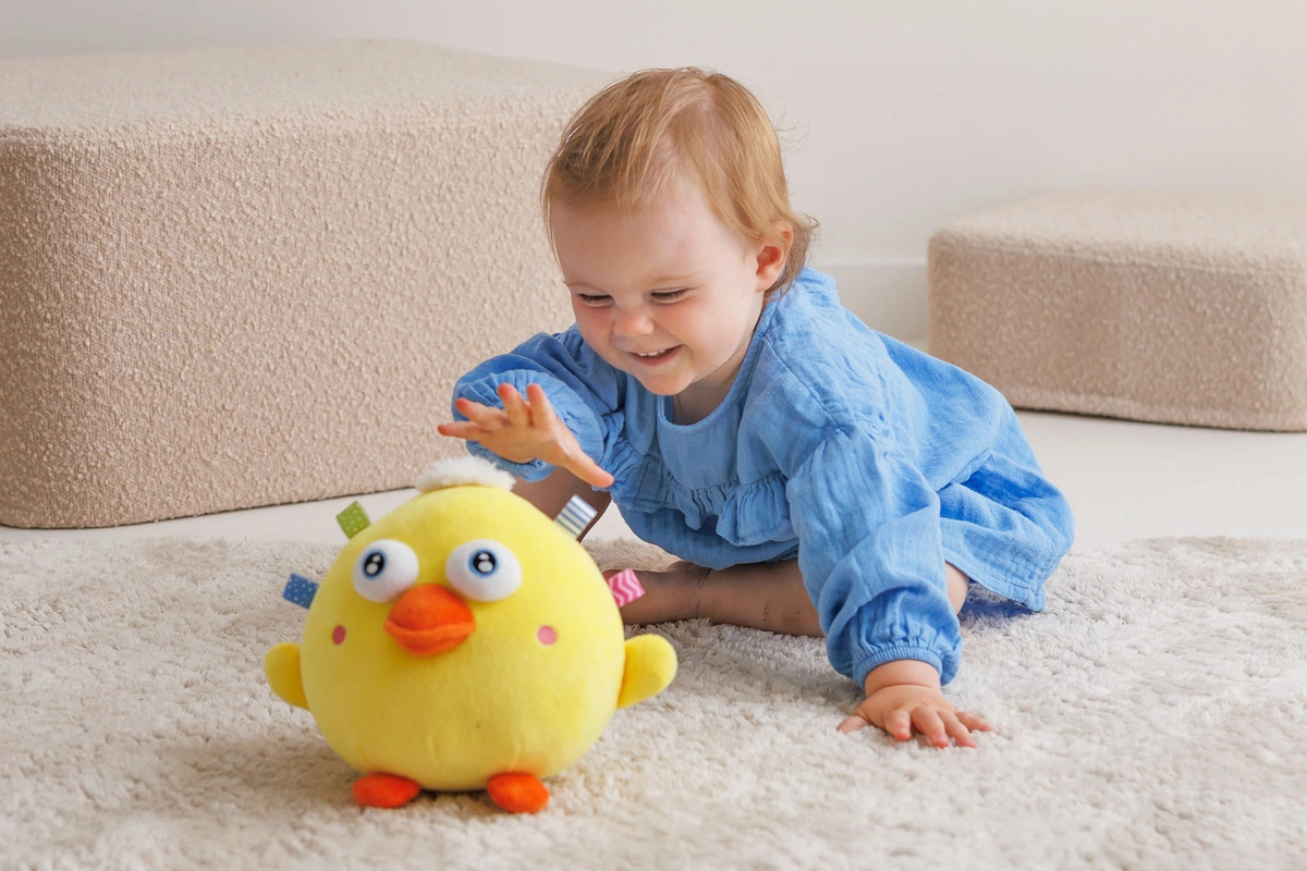 • piłkę uruchamia się poprzez naciśnięcie żółtego przycisku na plastikowej piłce (wewnątrz pluszowego zwierzaka);