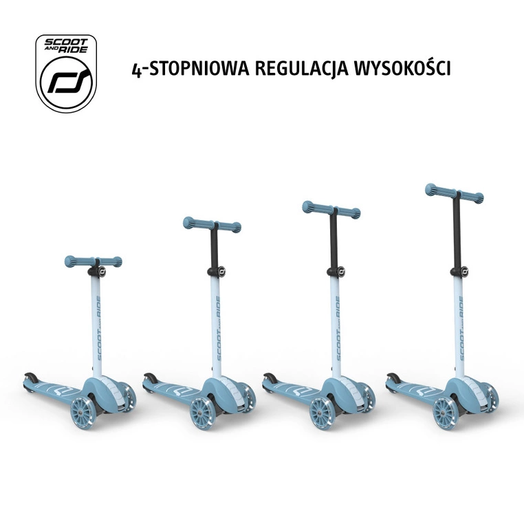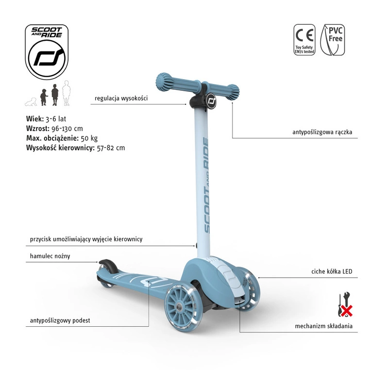 Kierownica ma również regulowaną wysokość – hulajnoga rośnie wraz z dzieckiem do 130 cm wzrostu. Antypoślizgowe, gumowe uchwyty są wygodne w trzymaniu i zapewniają pewny chwyt.
