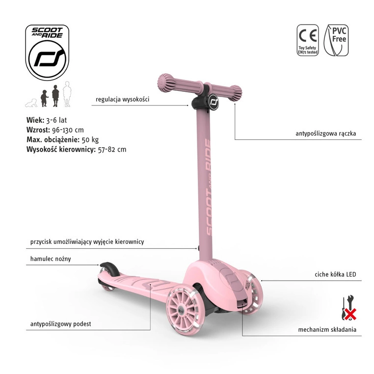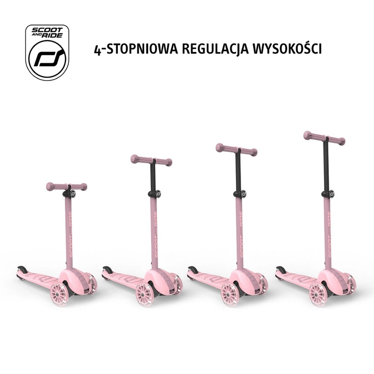 Kierownica ma również regulowaną wysokość – hulajnoga rośnie wraz z dzieckiem do 130 cm wzrostu. Antypoślizgowe, gumowe uchwyty są wygodne w trzymaniu i zapewniają pewny chwyt.
