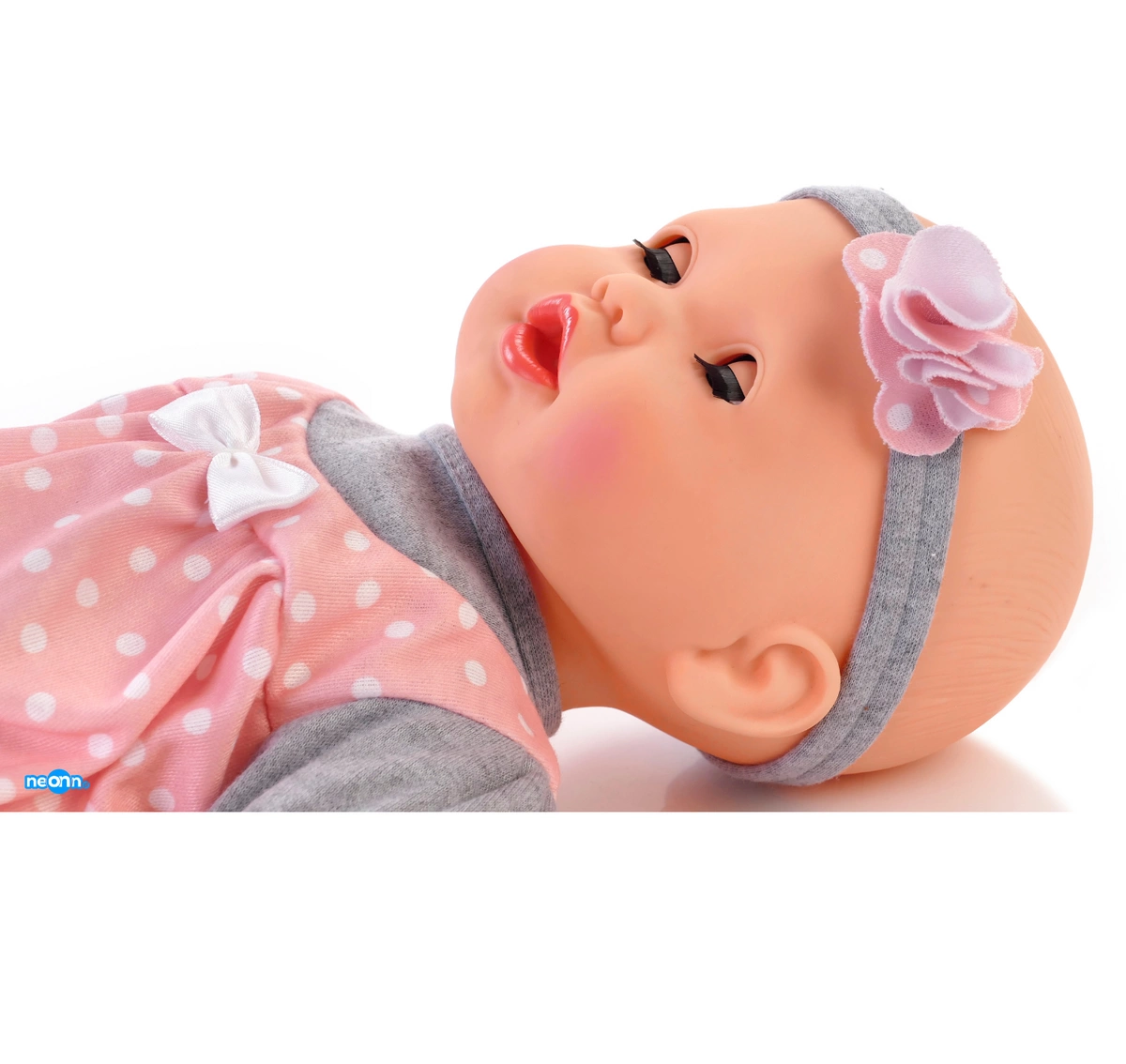 Lalka Natalia jest śliczna i zachowuje się jak prawdziwe niemowlę. Natalia ma gumowe ręce, buzię i nóżki, oczy otwiera i zamyka w zależności od pozycji ułożenia. Ubrana jest w ładne śpioszki, a na główce ma opaskę pasującą do ubranka. Urocza buzia lali sprawi, że dziecko chętnie będzie bawić się zabawką.