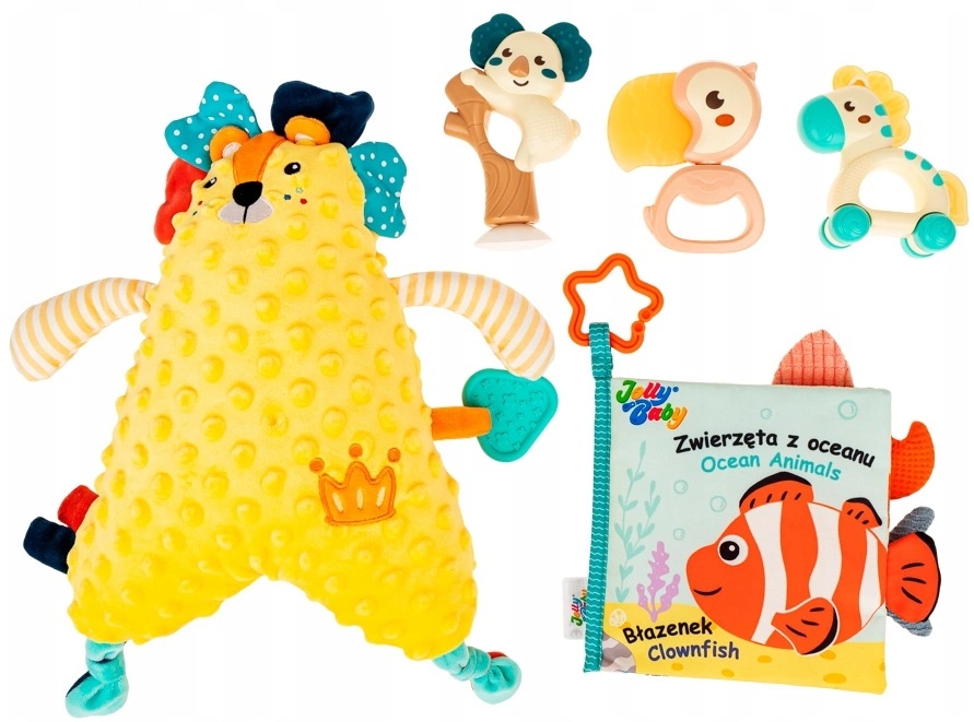 - w skład zestawu wchodzi 5 elementów: przytulanka Lew, materiałowa książeczka Zwierzęta z oceanu, grzechotka Koala na przyssawce , terkoczący gryzak Tukan, Zebra na kółkach;