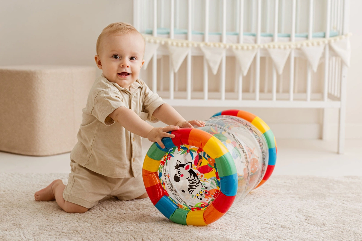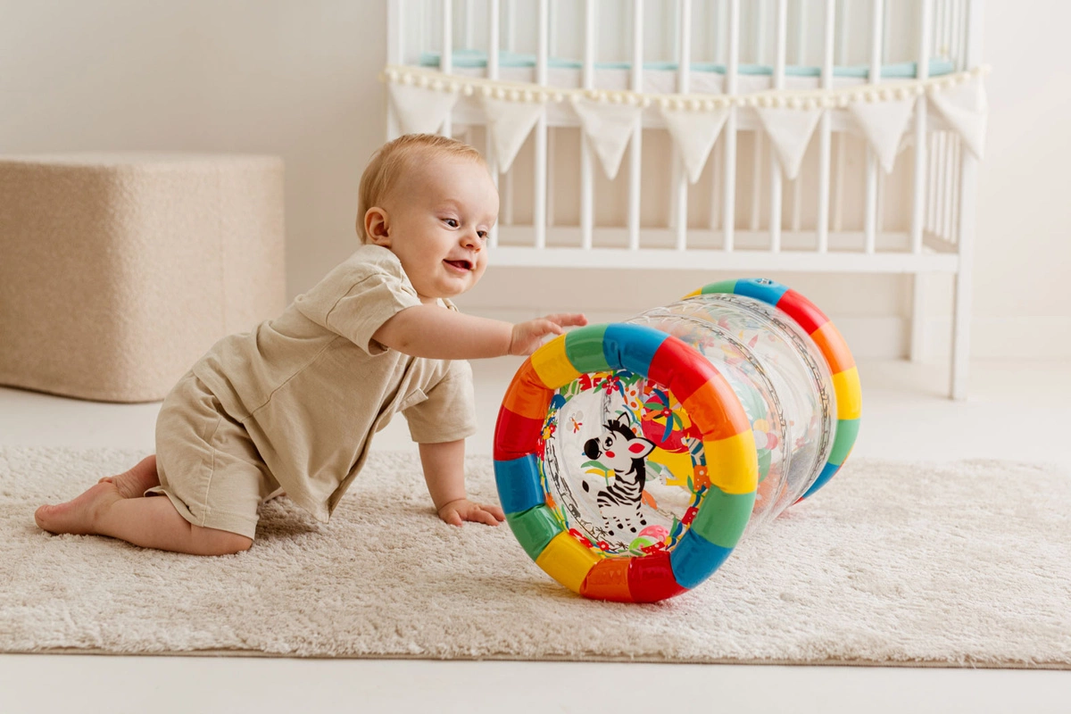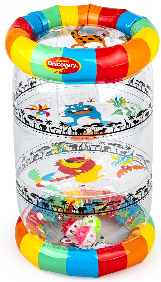 DUMEL Dmuchany roler do nauki raczkowania 44cm grzechoczące piłeczki