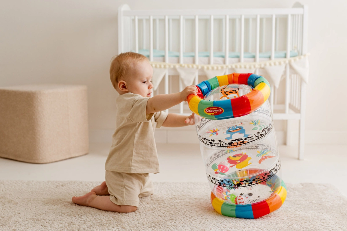 - 4 sposoby na zabawę z Rolerem: 1) turlaj roler, raczkując za nim; 2) trzęś rolerem, aby słuchać grzechotania piłeczek; 3) ustaw roler pionowo i manewruj nim tak, aby piłki wpadały w otwory; 4) zajrzyj przez przezroczyste ścianki i oglądaj obrazki;