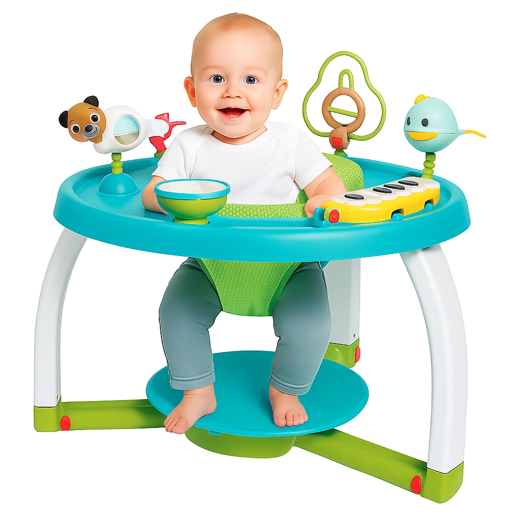 Obrotowe o 360 stopni siedzisko pozwala dzieciom bezpiecznie odkrywać świat pod każdym kątem, a wymienne zabawki angażują je i intrygują.