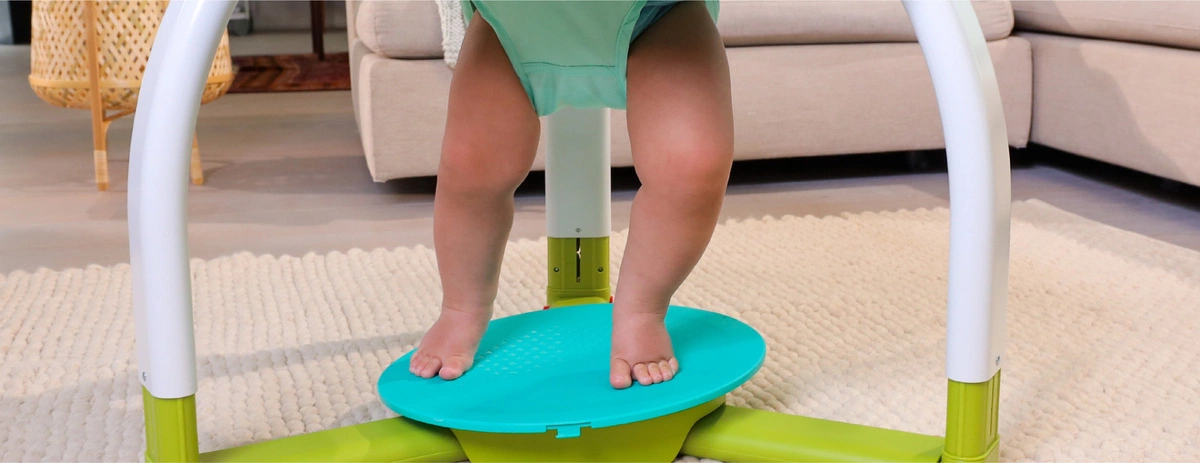Kiedy dziecko zacznie już samodzielnie siadać (ok szóstego miesiąca życia), możesz pozwolić mu siadać w centrum aktywności i korzystać z dołączonego podnóżka do balansowania, aby wzmocnić nogi i odkrywać różne doznania i tekstury stopami.
