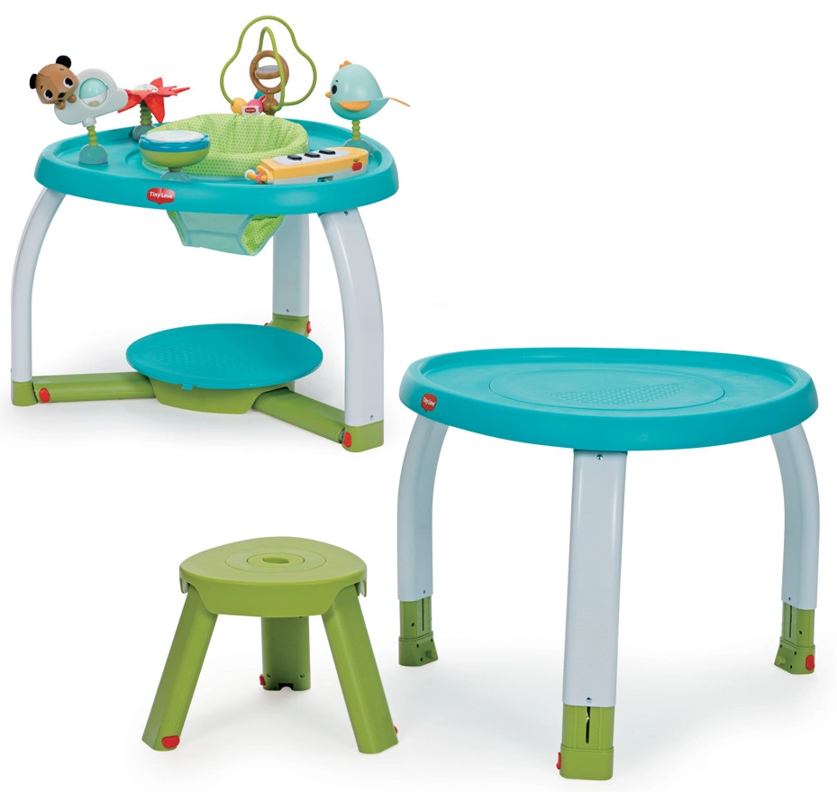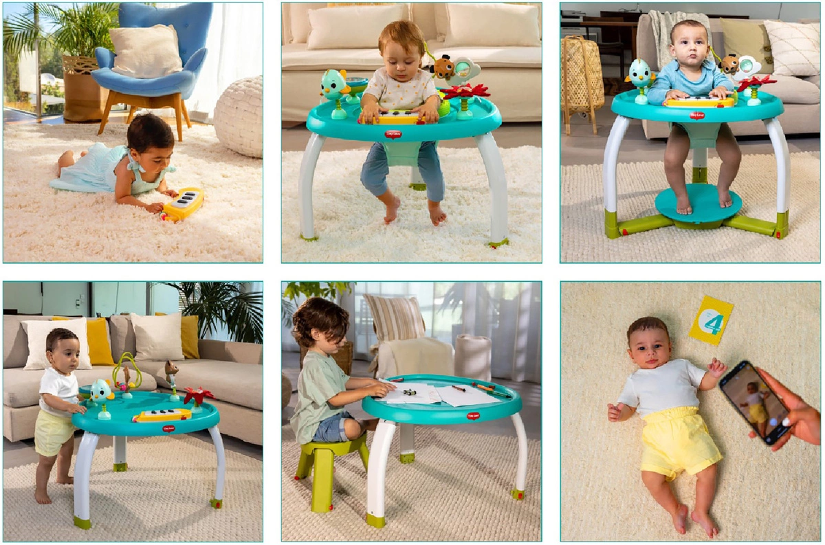 Zaprojektowany przy współpracy z pediatrycznymi fizjoterapeutami, zestaw rośnie wraz z maluszkiem i oferuje aż 5 trybów użytkowania: czas na brzuszku („tummy time”), płytę do wyważania dla niemowląt, stacjonarne centrum aktywności, stolik aktywności dla raczkujących oraz stolik z krzesełkiem dla chodzącego dziecka.