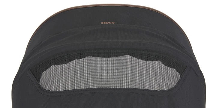 Wentylacja gondoli oraz siedziska spacerowego pozwoli maluszkowi odetchnąć z ulgą podczas wysokich temperatur. Dzięki temu rodzicowi łatwo będzie regulować temperaturę wewnątrz wózka. Wózek posiada również poszerzaną budkę z filtrem UPF50+ oraz powłoką hydrofobową.